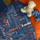 Texte de nom court typographique en bleu, gris, bleu cyan, orange et blanc sur une couverture personnalisée arrière - plan bleu foncé. La couleur Arrière - plan peut être modifiée si nécessaire. Un texte graphique personnalisé amusant couverture personnalisée. Idéal pour la voiture, le camping pour les nuits d'hiver ou les sorties. Personnalisez avec votre propre nom court, lit actuellement Lochie pour l'aide sur la personnalisation et d'autres longueurs de nom s'il vous plaît contactez-moi. © Art et design par Sarah Trett pour www.mylittleeden.com