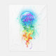 Grande méduse irisée, artistiquement dessinée, brillante, avec de longues tentacules sur le blanc, peinte sur l'arrière - plan multicolore. Méduse arc-en-ciel.