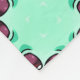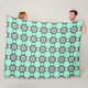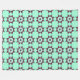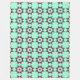 Towels with a mint green background displayed on a rack feature a geometric floral pattern in black and red. One towel is folded to show its pattern.
