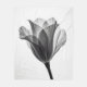A close-up, monochrome photograph showcases a tulip flower against a bright white background. The flower's petals are delicately rendered, with visible veins adding texture. The image captures the flower from a low angle, emphasizing its upward reach. The stem is slender and dark, contrasting with the lighter petals. The overall mood is serene and elegant, highlighting the flower's natural beauty.