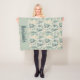 Couverture avec motif de Noël dans les tons vert mousse, avec neige, arbres de Noël et ornements, avec un rectangle vert mousse au fond et le nom de la personne qui recevra la couverture dans une typographie spéciale pour la saison