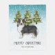Illustration originale de Destei d'un manteau tricolore noir couleur Pembroke Welsh Corgi race chien. Le chien est placé dans une scène hivernale avec trois sapins verts et la chute de neige. L'arrière - plan est un dégradé bleu à blanc qui donne un aspect froid d'hiver. Il y a aussi une zone de texte personnalisable qui se lit maintenant "Joyeux Noël !". Il y a une autre zone de texte personnalisable pour un nom de famille ou un autre texte personnalisé.