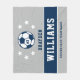 Une couverture en toison personnalisée sur le thème du football pour les joueurs de football quand ils ne marquent pas de buts sur le terrain, et pour leurs parents de soutenir leurs enfants et rester chauds à des jeux frais! Fait un cadeau d'équipe unique pour les tournois de voyage. Le design comprend un ballon de football customisé avec le numéro d'uniforme du joueur, un texte personnalisé pour le prénom et le nom du joueur et un texte moderne pour le nom de l'équipe du club de football. Le design élégant et moderne présente des lettrages jersey de variété sportive et des rayures horizontales simples avec des accents étoiles. Le jeu de couleurs gris clair, bleu marine et blanc peut être modifié pour correspondre aux couleurs de votre équipe.