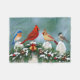 Une collection d'oiseaux chanteurs sur une clôture recouverte de neige décorée de guirlandes de Noël. Les espèces d'oiseaux comprennent le bleuet de l'est, les cardinaux rouges du nord et les poulets à capuchon noir. La clôture est ornée d'une guirlande de Noël constituée de branches de pin, de cônes et de baies sèches, agrémentée de cloches à sonnettes d'or et d'un ruban rouge vif.
