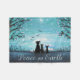 La paix sur terre avec deux chiens et chats silhouettent observer le coucher du soleil une soirée d'hiver. En couleurs de bleu, noirs et blancs. Avec deux arbres sur des côtés et des oiseaux volant vers le coucher du soleil. Chute de flocons de neige et deux ou trois étoiles lumineuses dans le ciel. L'art acrylique original de peinture de paysage d'hiver fait par Donna Leger pour l'ironie conçoit. Tous droits réservés