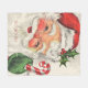 Belle carte de Noël vintage avec un Père Noël souriant aux joues rouges roses, disant HO HO HO. Il tient une grande canne en bonbon rouge et blanche dans sa main gantée verte.