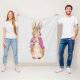 Pierre le lapin avec une veste rose et un arrière - plan de lin gris