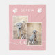 Belle, moderne et personnalisable design modèle photo de animal de compagnie dans les couleurs rose et blanc. Il y a deux emplacements photo personnalisés pour vos images. Un beau texte de script lisant "amour" chevauche la partie inférieure des images. En haut, il y a une zone de texte personnalisable pour un nom avec deux silhouettes empreintes de pattes blanches de chaque côté. La couleur rose arrière - plan peut être changée en n'importe quelle autre couleur en entrant dans l'outil de conception.