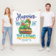 Design coloré et dynamique, avec un livre ouvert, un dragon coloré et des fleurs. Le texte coloré dit : "Plus heureux quand je lis". Ce design est disponible sur une grande variété de produits.