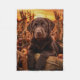 Profitez du charme rustique de l'automne avec notre superbe couverture présentant un adorable petit labrador au chocolat dans un champ de moisson alors que le soleil se couche dans l'arrière - plan.