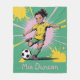 Illustration pop-art dynamique montrant une jeune joueuse de football avec un sourire doux et authentique. Elle est positionnée à mi-marche, en donnant un coup de pied à un ballon de football vers le spectateur, en portant un maillot jaune vif avec le numéro "7" dessus. L'arrière - plan explose avec des éclaboussures de peinture dynamiques dans une palette de jaune, vert, rose clair et violet, créant un sentiment de mouvement énergique et de chaos ludique, baigné par un éclairage lumineux et uniforme. La scène rappelle le style pop art emblématique d'Andy Warhol, mettant l'accent sur les couleurs audacieuses et les éléments graphiques.