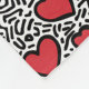 Ce motif vibrant présente des coeurs rouges et audacieux éparpillés sur un arrière - plan blanc rempli de doodles noirs dynamiques. Le design ludique, qui rappelle l'art pop, utilise des lignes fortes et des formes fantaisistes pour créer un visuel vivant et énergique. La juxtaposition de coeurs rouges vifs et de traits noirs abstraits évoque un sentiment d'amour et de spontanéité.