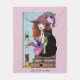 Une mignonne sorcière aux cheveux rouges tout en violet avec son chat noir assis sur une pile de livres. Potions, araignée et une bougie en toile de fond rose