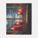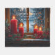 Beautiful watercolor image of a window looking out at the snow, there are pretty red candles with bright flames on the window sill and Pine Trees with Christmas lights outside the window. Lovely fleece blanket can be customized with any text, for your self or holiday giving.