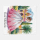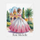 Illustration de style aquarelle d'une jeune fille en costume de quinceañera orné, devant un bâtiment de style colonial espagnol. La robe est blanche avec une jupe complète spectaculaire décorée de motifs floraux roses le long de l'ourlet, avec un corps rose avec de courtes manches casquettes. Ses cheveux sont stylisés dans un élégant updo avec des accessoires roses, et elle porte des boucles d'oreilles roses assorties. L'arrière - plan présente un bâtiment jaune et rouge avec des portes voûtées, des tours à dôme et des détails architecturaux espagnols. Le paysage comprend de grands cyprès, un palmier et des plantes du désert. Le ciel est peint en aquarelle bleue douce avec des nuages clairsemés. L'illustration a une qualité rêveuse et romantique avec des bords doux et des transitions de couleurs douces. Le sol présente un chemin en pierre et la palette de couleurs globale est composée de jaune, rose, vert et bleu doux.