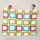 Cette grande couverture en toison présente un design moderne du milieu du siècle, avec des rectangles à pointes répétées en rouge, orange, vert et turquoise.