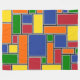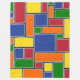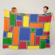 Cette grande couverture en toison a une conception Bauhaus de rectangles formés de lignes grises et remplis de rouge, jaune, orange, bleu et vert sur un champ de noir.