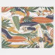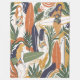 A playful illustration inspired by mid-century style. This wallpaper features stylized surfers in floral swimsuits, longboards in burnt orange, cream, and deep navy, and lush green tropical leaves arranged in bold, curved shapes. The warm, sun-washed color palette conveys a sense of relaxation and artistry.