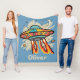 This vibrant UFO blanket features a classic, flying saucer taking off with fiery rockets against a starry night sky with the moon and planets.