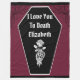 Gothic Dark Romance I Love You to Death Skeleton Fleece Blanket - Une couverture en toison sombre et moody avec un cercueil et une main squelette avec un rose, toiles d'araignées éffrayantes encadrent le haut. Avec des éléments de design rouge foncé, noir et blanc. Le texte de la coutume dit "Je t'aime à mort". Personnalisez en ajoutant le nom des destinataires. Un cadeau parfait pour une petite amie gothique, une femme aimante d'Halloween ou n'importe quel mari fanatique de film d'horreur ou un petit ami rock punk.