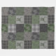 Décor de patchwork à thème boisé vert et gris. Plaids, Flèches, arbres, Et une tête de buck rustique.