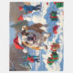 Une illustration de vacances réconfortante mettant en vedette un chien joyeux jouant dans la neige, portant un chapeau de Père Noël et entouré de boîtes de cadeaux colorées. En arrière-plan, des enfants construisent un bonhomme de neige à côté d'un arbre de Noël enneigé, créant un monde hivernal joyeux. Parfait pour répandre la joie des fêtes et capturer la magie de Noël.
