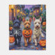 Adorable Scottish Terriers dressed in playful Halloween costumes carry pumpkin buckets while trick-or-treating under the moonlit sky. This festive design highlights the breed’s distinctive beard, perky ears, and bold personality, perfectly capturing the spooky yet fun atmosphere of Halloween night. A charming celebration for Scottish Terrier lovers, dog enthusiasts, and Halloween fans alike.