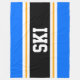 Cette conception sportive et sportive présente un texte SKI audacieux à l'intérieur d'une large bande noire surlignée avec deux bandes de course blanches et jaunes contre des bandes extérieures bleu vif. Le texte peut être personnalisé.