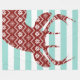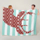 Une couverture avec un cerf rouge avec flocon blanc et motif zigzag sur un arrière - plan rayé bleu et blanc.