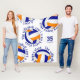 Cette couverture en molleton à thème de volley-ball amusante comporte 5 volleyball bleu, orange et blanc arrangés aléatoirement avec le texte "Le terrain de volley est mon endroit heureux" en orange encerclant chaque volleyball dans une police typographique cool, le tout sur un arrière - plan blanc - son nom et son numéro de maillot sont personnalisables - par katz_d_zynes