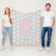 Cette couverture en toison à thème de volleyball amusant comporte le texte, "Le terrain de volleyball est mon endroit heureux" en rose dans une police de style mignonne, décontractée, manuscrite - l'arrière - plan est gris clair avec un motif de petites volleyballs blancs - son nom et monogramme sont personnalisables - par katz_d_zynes
