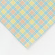 The image shows a two-sided fabric swatch. The front features a subtle pastel plaid pattern, while the back is plain white, conveying a calm, neutral tone.