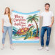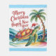 Une carte de voeux de Noël fantaisiste avec une aquarelle joyeuse illustrant une tortue de mer portant un chapeau de Père Noël festif et ornée de lumières scintillantes de Noël enfilées autour de sa coquille, posée sur fond de palmier balançant également éclairé par des lumières chaudes et un océan turquoise serein. La coquille de la tortue est peinte de motifs complexes de fleurs tropicales dans les tons pastel doux de corail, lavande et vert d'eau de mer, tandis que l'océan brille avec de subtils gradients de bleu et d'argent, créant une atmosphère paisible mais festive. "MERRY CHRISTMAS & HAPPY NEW YEAR" apparaît dans une police ludique et lettrée sur le dessus de la carte, avec l'intérieur offrant un espace blanc propre pour un message personnalisé et un motif subtil et répétitif de petits coquillages le long du bord inférieur pour renforcer le thème tropical. Le ton général est léger et joyeux, parfait pour envoyer des voeux chaleureux à des amis et à la famille pendant la période des fêtes.