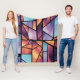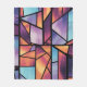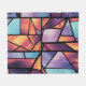 Un magnifique et vibrant morceau d'art en vitrail géométrique avec un ensemble de formes croisées et de riches teintes de violet, bleu et orange. Le design complexe et la palette de couleurs dynamiques créent une expérience visuelle fascinante, parfaite pour ajouter une touche d'élégance moderne à tout espace.