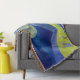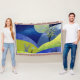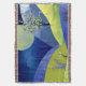 Un paysage abstrait représentant des collines ondulées avec un arbre printanier fleuri et des plantes et une lune et des étoiles dans les tons bleu, cyan, jaune et rose.