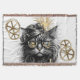 An intriguing looking pussy cat wearing a leather hat with steampunk brass on it. A golden feather tops the cock-eyed hat. This beautiful feline is wearing a golden or amber lensed monocle giving one eye a bronze tone, Around the cats neck hangs a brass trinket of some kind adding to the overall Steampunk attire. Brass cogs of the Victorian Technical era surround this intelligent looking feline.