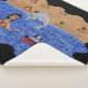 Cette couverture en toison Sherpa a une jolie scène de plage d'une dame et de son chat noir et blanc flottant dans des tubes intérieurs à fleurs rouges dans l'océan avec un dauphin gris sautant de l'eau avec une plage de sable parsemée de parasols colorés dans un cadre noir ondulé.
