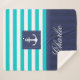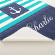 Une couverture Sherpa avec motif rayé bleu turquoise et bleu marine et une ancre.