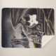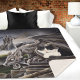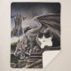 Le chaton tuxedo noir et blanc est assis à côté d'une gargouille. Derrière eux se trouve un château et des dragons.