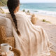 Ivory-based coastal design featuring layered taupe mist texture prints with a soft champagne shimmer print overlay. The airy watercolor movement pairs beautifully with light woods, woven accents, and neutral upholstery, making it ideal for draping across a sofa, bed, or reading chair in a refined beach-inspired interior.