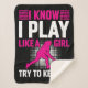 Hockey Jouer comme une fille sherpa couverture dispose d'une silhouette joueur de hockey féminin et le texte dit Je sais que je joue comme une fille Essayez de tenir!