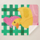 Un charmant canard en caoutchouc enveloppé d'un turban à serviettes roses est posé sur des serviettes douces et douillettes. L'arrière - plan vert vif en vichy ajoute un contraste ludique aux tons chauds pastel. Parfait pour ajouter une touche de fantaisie et de relaxation à tout espace !