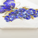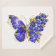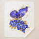 Bijoux, bleu, saphir, papillon aux fleurs pétillantes avec aile décorée de bleu, fleurs précieuses avec feuilles d'or sur arrière - plan blanc.