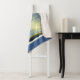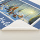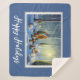 Fun Holiday Sherpa couverture caractéristiques fantaisie et surréaliste de la forêt de Noël avec des arbres enneigés, créé avec un logiciel générateur d'IA. Le texte "Happy Holidays" sur arrière - plan bleu est personnalisable.