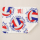 Cette couverture en polaire sherpa de volleyball sportive est composée de 5 volleyball rouge, blanc et bleu disposés aléatoirement avec le texte "Le terrain de volleyball est mon endroit heureux" en rouge encerclant chaque volleyball dans une police typographique amusante, le tout sur un arrière - plan blanc - son nom et son numéro de maillot sont personnalisables - par katz_d_zynes
