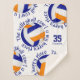 Cette jolie couverture en molleton à thème de volleyball sherpa dispose de 5 volleyball bleu, orange et blanc arrangés aléatoirement avec le texte, "Le terrain de volleyball est mon endroit heureux" en orange encerclant chaque volleyball dans une police typographique amusante, le tout sur un arrière - plan blanc - son nom et son numéro de maillot sont personnalisables - par katz_d_zynes