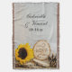 Le jet rustique naturel de mariage de région boisée de tournesol peut être personnalisé avec les noms des jeunes mariés et de la date de cérémonie de mariage pour créer un cadeau durable de souvenir pour les nouveaux mariés. Les bois extérieurs faits sur commande chics de ce pays ou la couverture nuptiale de thème de forêt comporte une photographie florale numériquement augmentée étrange d'une tranche jaune de fleur et en bois de tournesol avec le mot AMOUR brûlé dans lui avec une toile de jute et un arrière - plan blanc de satin.