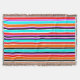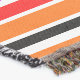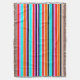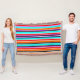 Cette couverture de lancer a un design simple de bandes verticales de différentes épaisseurs en rouge, orange, violet, noir, bleu clair et blanc.