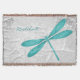 Ajoutez une touche de couleur à votre séjour ou à votre chambre avec une couverture de Throw personnalisée Dragonfly Turquoise. Le design de la couverture comprend une libellule colorée, une vigne feuillue blanche molle contre un arrière - plan damassé gris clair avec une zone à personnaliser avec votre nom. Autres cadeaux disponibles avec ce design ainsi qu'une variété de couleurs.