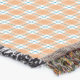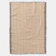 "Two images of a woven blanket featuring a beige and light blue plaid pattern with fringe edges. The blanket is shown horizontally and vertically."